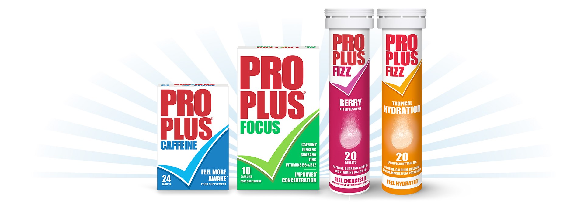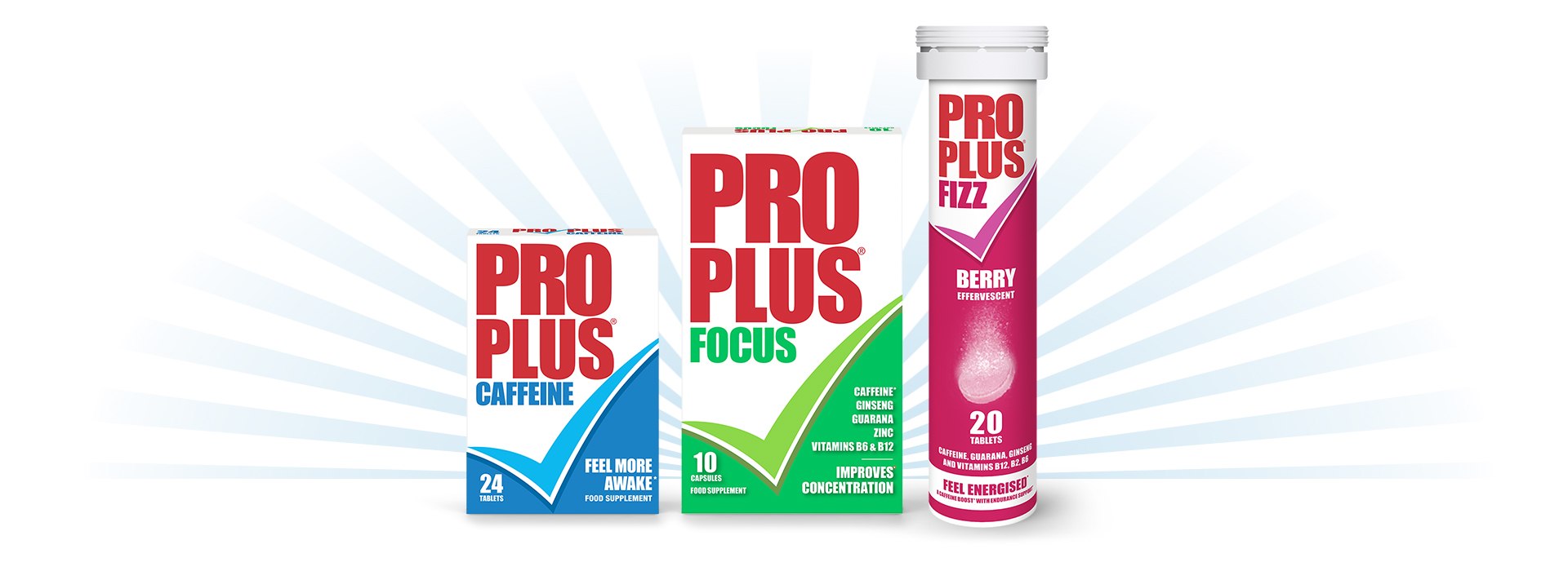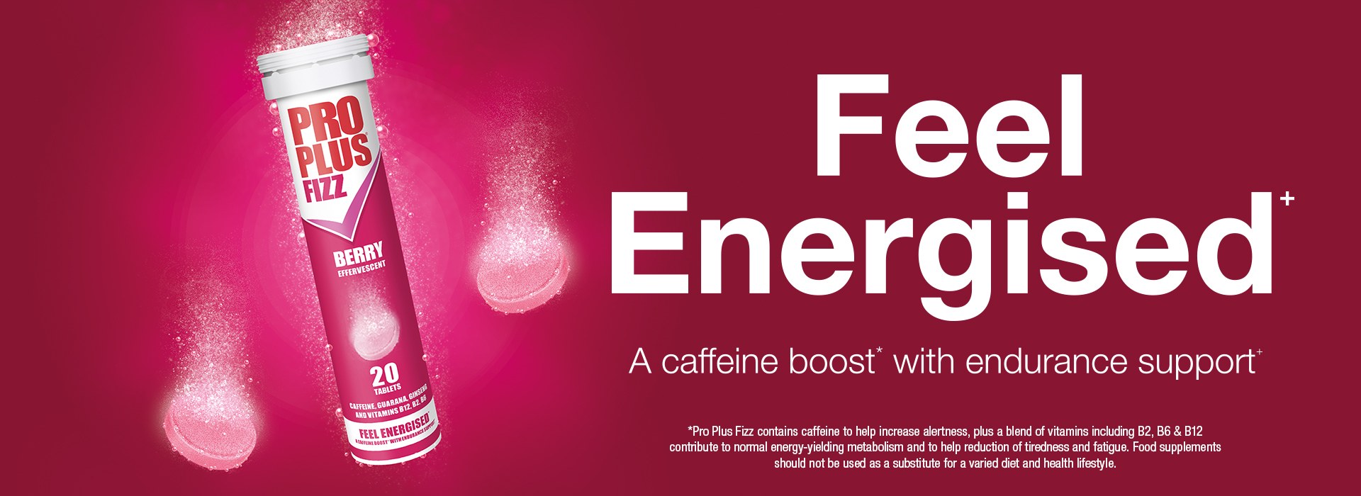 Pro Plus Fizz contains caffeine to help increase alertness, plus a blend of vitamins including B2, B6 & B12, that help reduce tiredness and fatigue throughout the day.3 They come in a delicious red berry flavoured fizzy tablet. Just drop one tablet into a glass of water for a caffeine boost with endurance support.